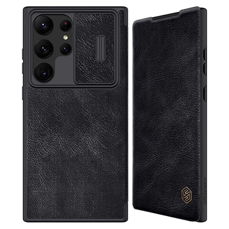 جراب محفظة AWH Nillkin Basic مع غطاء للكاميرا وحامل للبطاقات، جراب من جلد البولي يوريثان مع غطاء قلاب لحماية الكاميرا المنزلقة لسلسلة Galaxy S23، أسود (جراب S23 Ultra Qin/Flip/Book)