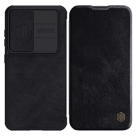 جراب محفظة أساسي من AWH Nillkin مع غطاء للكاميرا وحامل للبطاقات، جراب من جلد البولي يوريثان مع غطاء قلاب لحماية الكاميرا المنزلقة لهاتف Galaxy S23 Plus، أسود (جراب S23 Plus Qin/Flip/Book)