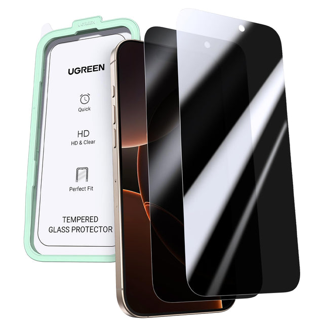 【Compatibility】Only designed for iPhone 16 Pro Max 6.9 inch. 【Pioneer 100% Privacy Protection】UGREEN iPhone 16 Pro Max privacy screen protector offers an ultra-narrow 28° privacy angle, providing a broad 152° anti spy range, which means the screen can only seen by the person facing it. Effectively protect your privacy and important information from strangers and outlookers on metro, elevator, bank, office and any other public occasions. 【TOP 9H+ Glass, Ultimate Drop Defense】Adopting upgraded Military-Grade composite anti-drop tempered glass with 2024 debuting anti-compress edge technology, UGREEN 16 Pro Max Screen Protector has a hardness level far exceeding 9H and can effectively resist against the most common edge cracking situations without fear of any drop or impact. 【Seamless Fit, 1:1 Full Coverage】Using iPhone 16 Pro Max to make 1:1 screen shape replication, UGREEN private screen protector encircles every curve of the screen with a strengthened black edge, completely protecting the vulnerable screen edges from cracking and preventing dust from sticking to the edges. 【Easy to Install】Just use the alignment frame and finish the film application in 1 minute! The package also comes with two sets of dust-repellent adhesive and cleaning kit, which can ensure effortless, bubble-free application. 【Professional & Strict R&D System】UGREEN is committed to creating professional phone cases and screen protectors that can lead the industry standards. The most recent technologies are continuously being developed by our experimental R&D department, and our products must go through 12 rigorous quality inspection tests before reaching customers' hands. 【What You Get】2 * UGREEN privacy screen protector for iPhone 16 Pro Max, 1* alignment frame, 2* installation accessory kit, 1 * user manual, 24-month warranty, 24-hour customer service, lifetime technical support.
