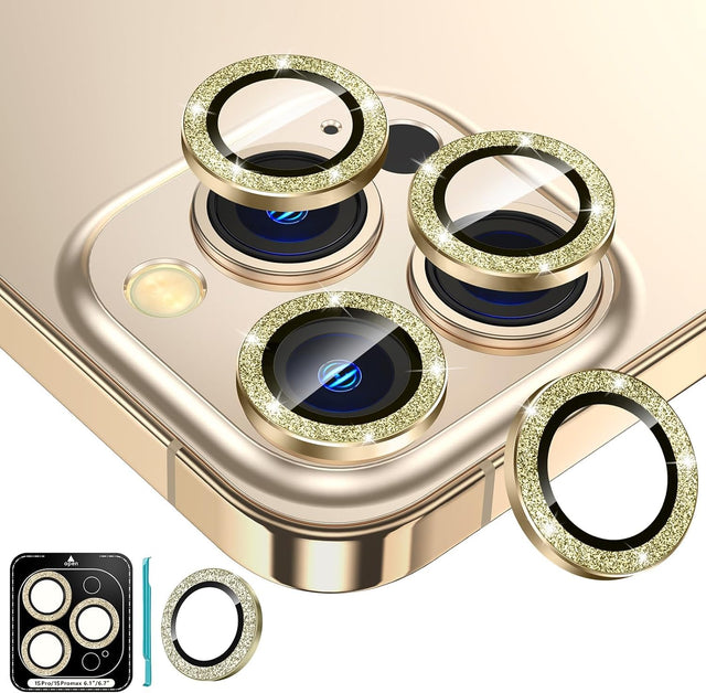 واقي عدسة كاميرا AWH 3+1 لهاتف iPhone 15 Pro/Pro Max - زجاج مقوى 9H، فائق الدقة، غطاء واقي شاشة كاميرا معدني فردي لهاتف iPhone 15 Pro/Pro Max (ذهبي لامع)