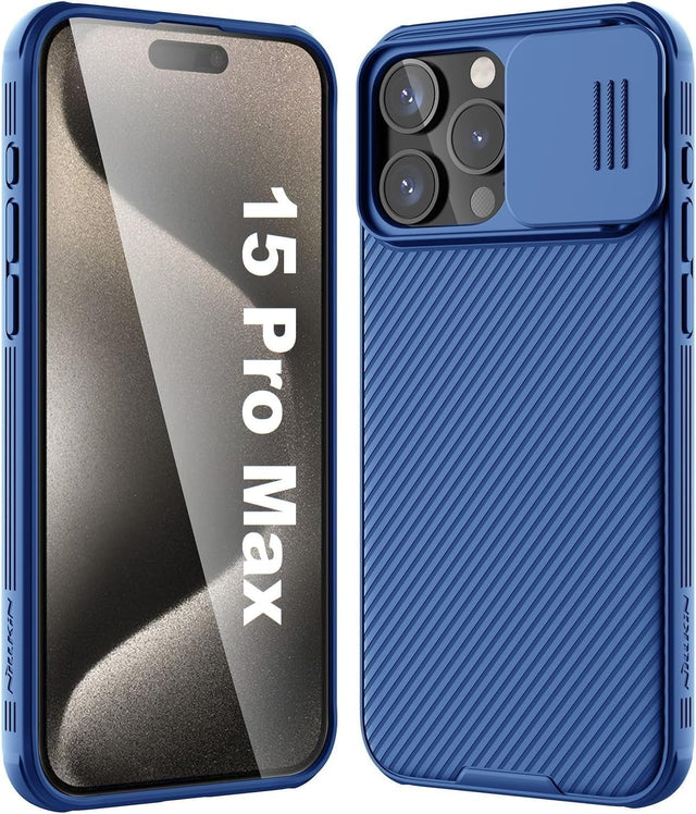 جراب AWH لهاتف iPhone 15 Pro Max Camshield مع حماية منزلقة لعدسة الكاميرا - غطاء خلفي من البولي كربونات وإطار ممتص للصدمات من مادة TPU مضاد لبصمات الأصابع، جراب ناعم الملمس (أزرق)