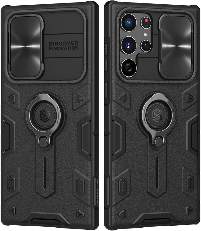 جراب AWH لهاتف Galaxy S22 Ultra مع غطاء للكاميرا وحامل، جراب CamShield Armor مع حماية منزلق للكاميرا وحامل حلقي دوار، جراب مقاوم للصدمات بدرجة عسكرية، (أسود)