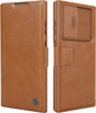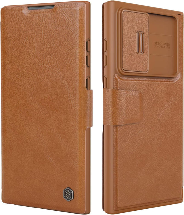 جراب محفظة AWH Galaxy S23 Ultra مع حامل بطاقات وغطاء للكاميرا، جراب من جلد البولي يوريثان مع غطاء قلاب مغناطيسي، وفتحة بطاقة، وحماية منزلقة للكاميرا (6.8 بوصة) - بني