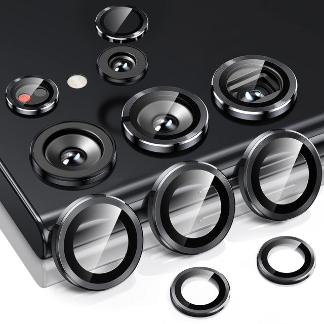 واقي عدسة كاميرا AWH Hoerrye لهاتف Samsung Galaxy S23 Ultra، مناسب للحافظات، مصنوع من زجاج مقوى 9H مضاد للخدش، دائرة حماية عسكرية من التيتانيوم الفضائي، أداة إزالة (أسود)