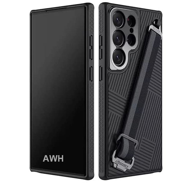 جراب حماية AWH Nillkin مع حزام حبل متعدد الاستخدامات ثلاثي الأبعاد لهاتف Samsung Galaxy S23 Ultra، واقي إطار عدسة معدني، حماية كاملة 360 درجة، زوايا وسادة هوائية مضادة للسقوط، رياضي، تصميم عملي (أسود)