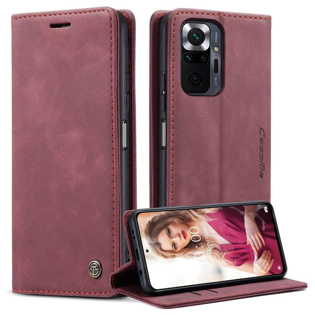 جراب محفظة جلدي بتصميم موجز مع خاصية الشفط التلقائي لهاتف شاومي ريدمي نوت 10 برو 4G (الهند)/(العالم)/نوت 10 برو ماكس - أحمر