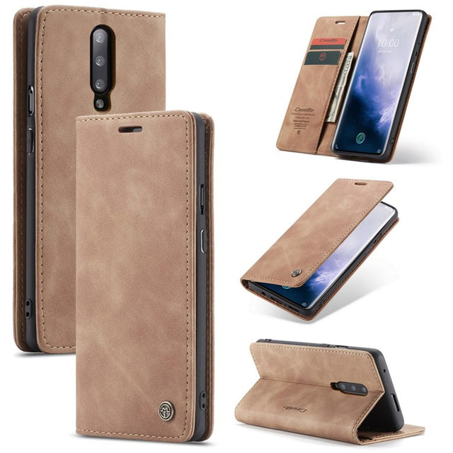 غطاء هاتف UniqCase لهاتف OnePlus 7 Pro مصنوع من جلد البولي يوريثان مع حامل ومحفظة يتم امتصاصه تلقائيًا - بني