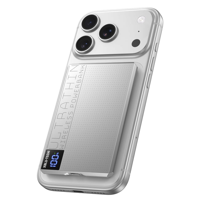 بنك طاقة لاسلكي فائق النحافة MP5 من Xblu-Tech بسعة 5000 مللي أمبير/ساعة - شحن لاسلكي سريع بقوة 15 وات وشحن سلكي بتقنية PD بقوة 20 وات، شاحن محمول رفيع <1 سم لأجهزة iPhone وSamsung وأجهزة USB-C